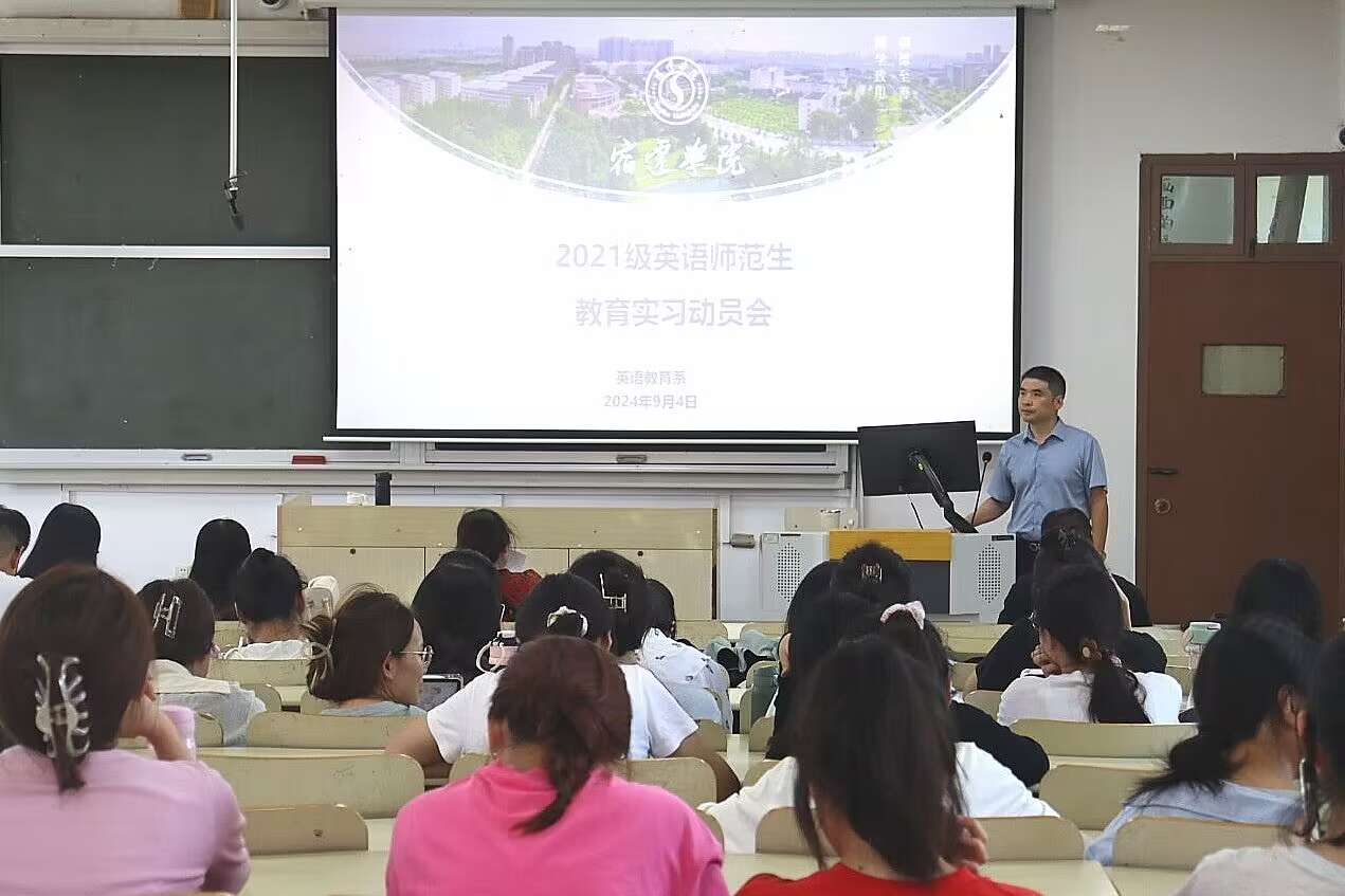 为有效推进英语师范生实习工作,激发同学们对教育实习的热情,增强责任意识和安全意识,2024年9月4日下午两点,英语教育系于五阶召开了2021级英语师范生教育实习动员会。教育实习指导教师、2021级全体英语师范生参加会议,会议由英语教育系系主任刘彬主持。