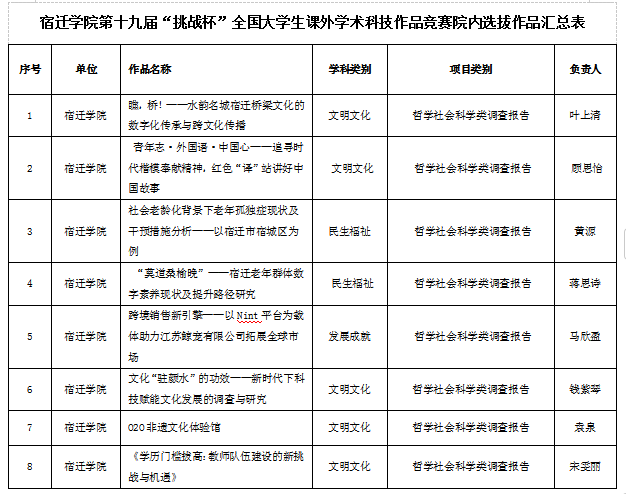 为聚焦学校高素质应用型人才培养目标,进一步引导和激励外国语学院青年学生刻苦钻研、勇于创新,推动学生参与学术科技实践,培养青年学生的创新精神、创业意识和实践能力,外国语学院组织开展了宿迁学院第十九届“挑战杯”全国大学生课外学术科技作品竞赛院内选拔赛。