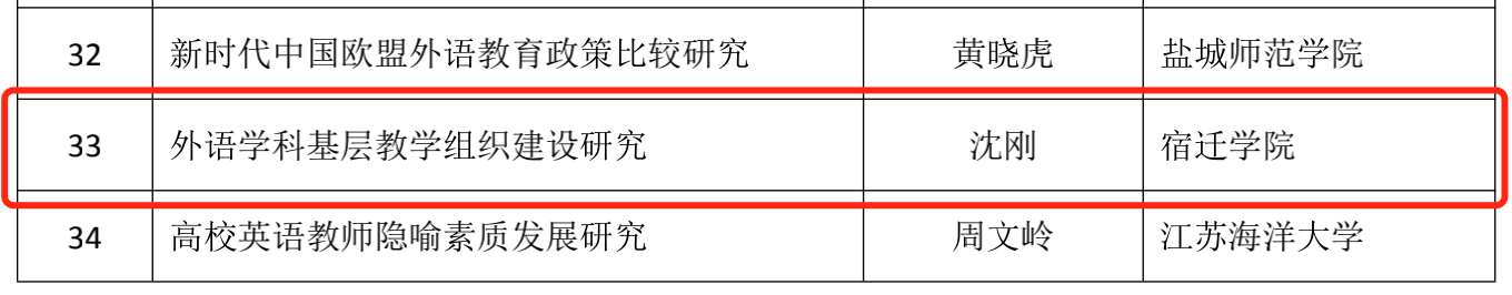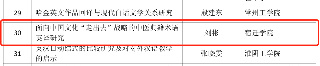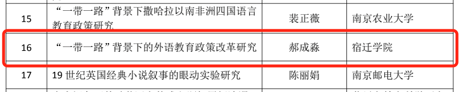其中,外语学科基层教学组织建设研究》和《“一带一路”背景下的外语教育政策改革研究获批一般资助项目。《面向中国文化“走出去”战略的中医典籍术语英译研究》和《课程思政背景下高校外语教师教学能力结构与提升路径探究》获批立项不资助项目。