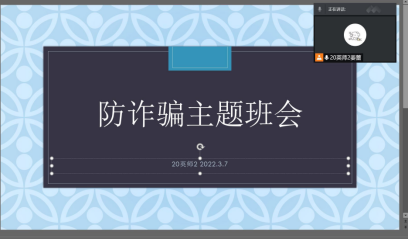 2022年3月8日,为了提高同学们的防诈骗意识,提高自我防范能力,外国语学院大一、大二、大三的全体学生以各班级为单位组织开展了防诈骗主题班会,以此宣传防诈骗知识。