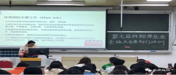 第七届外国语学院学生会全体大会兼部门培训圆满结束。通过本次会议,各位部长对更明白了自己的职责所在,要及时向各位志愿者们提供帮助与咨询,让他们更好地融入学生会,更好地进行工作,为外院同学们服务。与此同时,各位志愿者们也对学生会有了更加清晰的认识,对自己加入的部门有了更明确的定位,对于未来的部门工作有了更加细致的规划。他们也明白了自己身上的责任是非常重大的,他们的一举一动都代表着外院学生会的形象,这就更加要求他们要严于律己,认真工作,做好表率作用。希望大家能够共同努力,共同进步,共同打造一个更加团结、和谐、认真、向上的学生会。让学生会在未来的道路上能够走的更加长远,更加稳健!