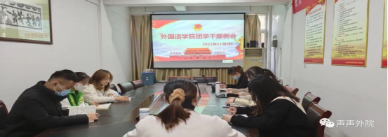 2021年11月9日下午4∶10,外国语学院在系办210召开了团学干部例会,出席本次会议的有团总支书记王姗老师以及团总支的副书记王嫣、委员易健颖、时梦月、田佳梓和学生会主席李安宁,副主席马博文、施祺。