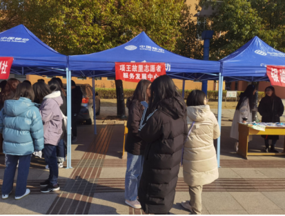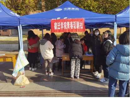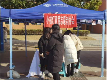 首先映入眼帘的是青春话剧社,部长们悉心向新生介绍每个部门的职责,鼓励大家根据自身的兴趣特长来选择心仪的部门;旁边是小桔灯童爱志愿者协会,亭帘上挂着一系列志愿活动时的照片,社长热情地为大家提供了糖果和柑橘,“一夜秋风桔子黄,一半入口齿留香”,小桔灯社团用爱温暖了留守儿童的心;对面是项王故里志愿服务活动发展中心,这是一个新生的社团,充盈着朝气与活力,在外院学子们的带领下,外国旅客畅游宿迁特色古城,观赏项王故里美景。