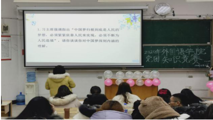 为活跃支部文化氛围,激发宿院团员青年学习党团知识积极性,进一步向党组织靠拢。12月18日下午6:30,宿迁学院外国语学院举办了2020年党团知识竞赛活动,出席本次竞赛的有团总支三位副书记、各部门部长和外国语学院全体大一新生。