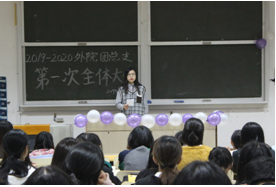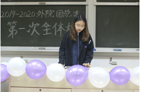 2019年10月12日下午5:20,2019-2020年外院团总支第一 次全体大会在一号楼六阶教室准时开始。出席本次会议的有团总支副书记陈洁、苗梦玲和张雨嫣,各部部长及各部门成员。