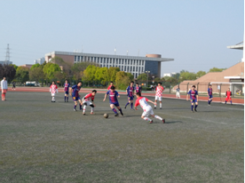随着一声哨响比赛开始了,由我们院先发球。发球后,我院率先抢到了球,球员冲出后卫的防线,一个假动作,成功传球,抬腿、踢,可惜了,球没进框!白色蓝色的身影在赛场上穿梭,奔跑、跳跃、飞踢,脸上的汗水在阳光的照射下闪闪发光可没有球员伸手擦一下,他们全程紧盯着脚下的足球,毫不松懈。在约30分钟的比拼后,上半场比赛结束了,建筑工程学院暂时领先。
