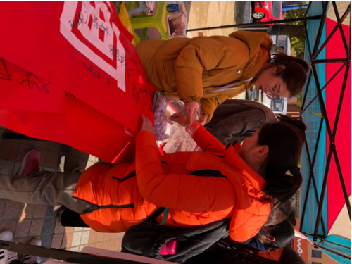 今日上午十点,学生会成员们准时在一二餐之间出摊,准备好了精美的礼品,等待着女孩们的到来。很快,摊位边就聚满了人,她们在活动横幅上签下名字,然后进行抽奖,奖品有面膜、零食、文具等,女孩儿们不亦乐乎地参与进来,享受着属于她们自己的节日。