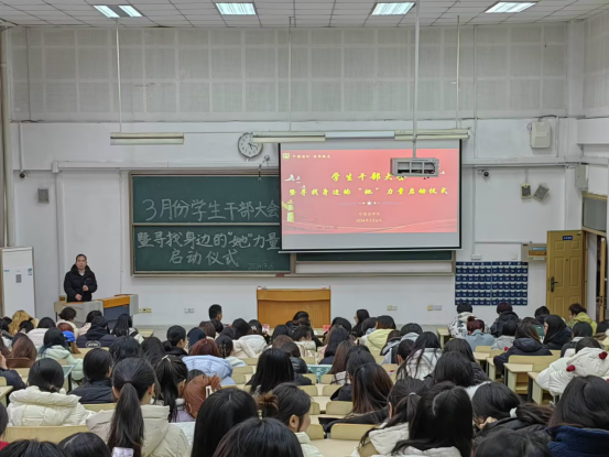 3月6日下午,外国语学院于3101教室召开3月学生干部大会暨寻找身边的“她”力量启动仪式。学院各学生组织学生干部、班长及全体宿舍长参会,学院党委副书记王倩、分团委书记王姗、辅导员吴耀、周慧敏出席会议,会议由院学工办副主任李战成主持。