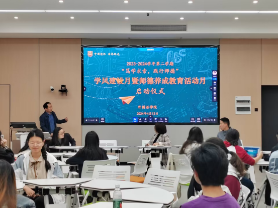 为了进一步推进学院学风建设,加强师范生师德师风建设,4月13日上午9点,外国语学院在四阶举行了"笃学求索 践行师德"学风建设月暨师德养成教育活动月启动仪式。学院党委副书记王倩、全体辅导员、学生会及分团委主要学干及大一至大三各班班长参加。