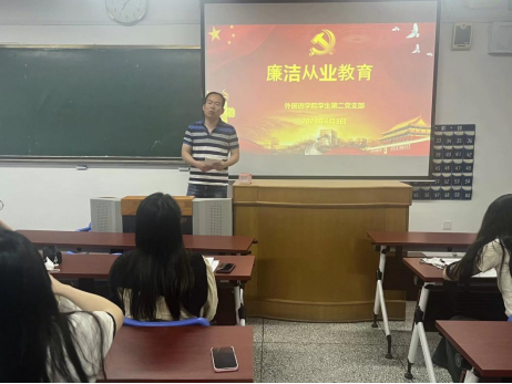 2024年6月3日,外国语学院学生第二党支部在1201教室开展了一场针对大学生党员的毕业前廉洁从业教育活动。活动由学院学生第二党支部组织委员周慧敏主持,支部书记李战成主讲。