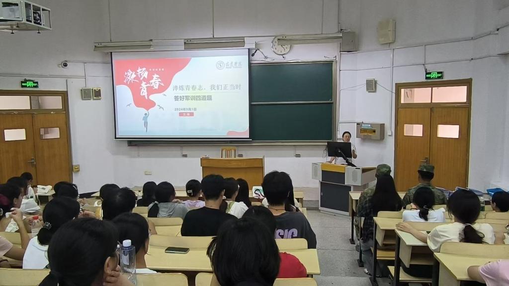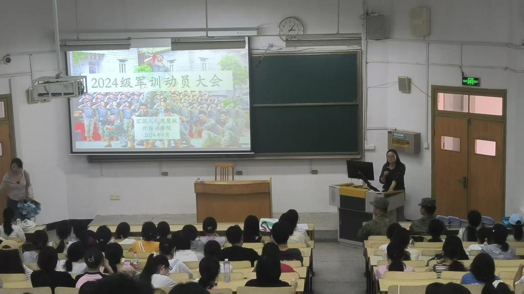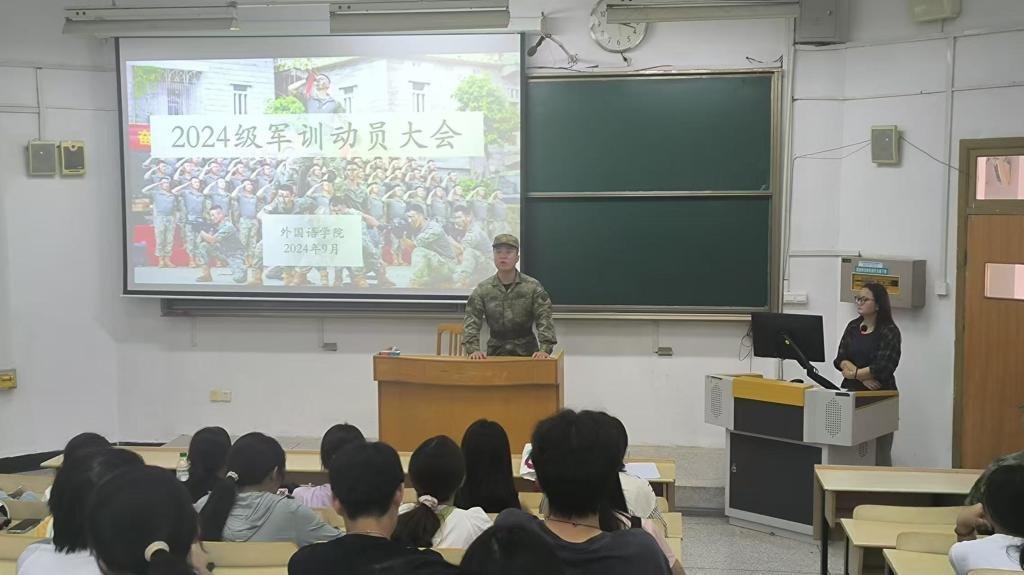 为了迎接即将到来的军训,外国语学院于2024年9月1日下午3点在教学楼4212开启军训动员大会,出席本次动员大会的有:外国语学院党委副书记王倩,2024级辅导员周慧敏,新生教官孔浩宇、施嘉宇,以及全体2024级新生。