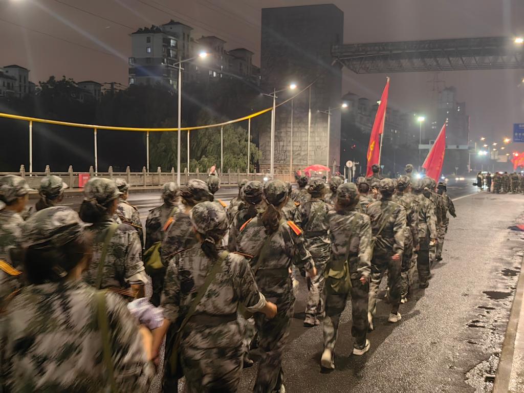 晚上19点30左右,外国语学院六营一连、二连整装待发,在学校喷泉广场北侧集合完毕。20点整,六营全体出发,自学校西门经古楚大桥向北,军容整肃,一路步伐整齐,口号响亮,穿过烟幕区,体验夜行军,全程将近8公里,从学校东门凯旋。同学们纷纷表示,团队里享受着协作感,拉练中体会到战友情。