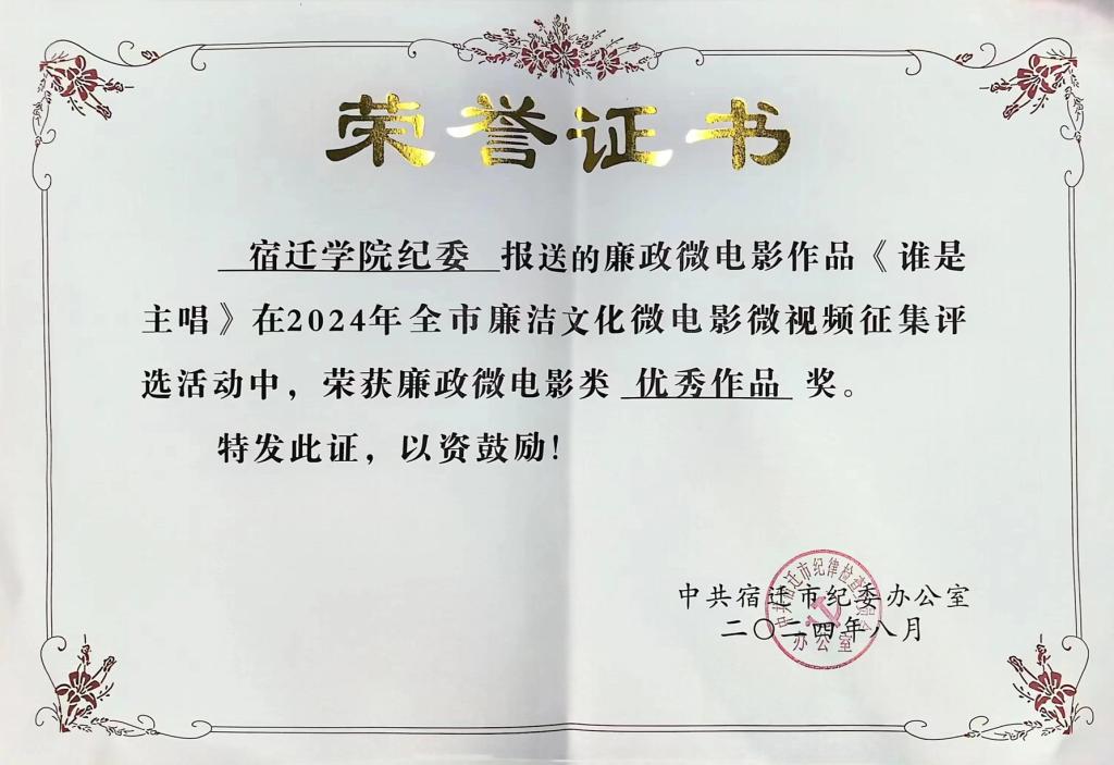 在全市多家部门单位选送的56件廉政微电影作品中,学院党委创作的《谁是主唱》获得2024年宿迁市廉政微电影优秀作品奖。该微电影作品是由学生团队自编自导自演,演绎了主要学生干部在演唱会主唱人选选择时,不正确行使手中职权一事。剧情深刻警示了学生干部们要以身作则,自觉抵制不正之风,恪守纪律,严以律己,营造风清气正的良好学风。