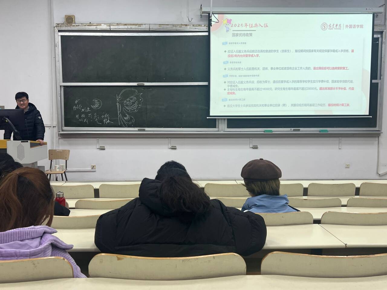 为引导学生响应祖国号召、携笔从戎,到军营建功立业。外国语学院于2024年12月18日在一阶开展2025年春季征兵入伍宣传活动,2023级全体学生参加。2023级李启程老师主持。