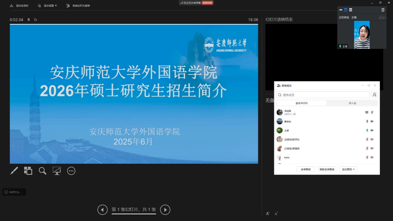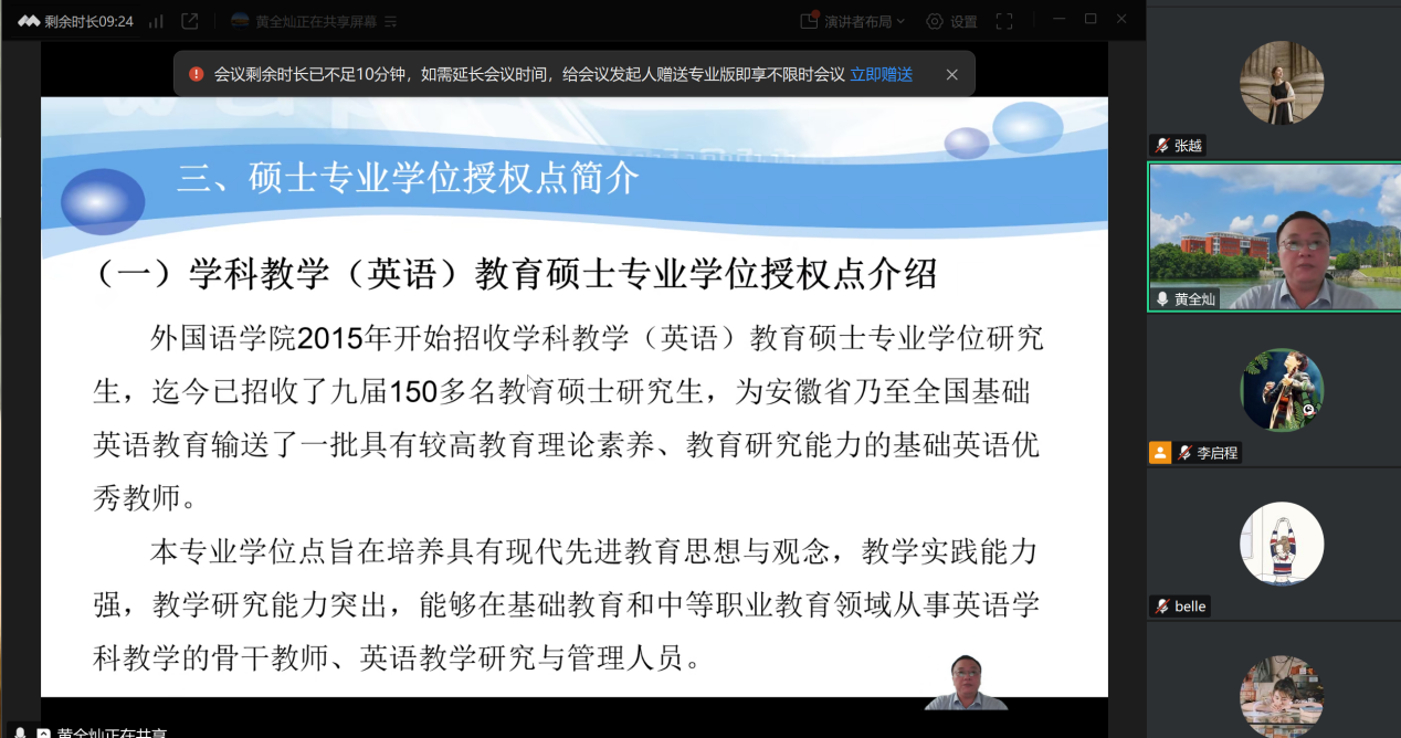 2025年6月12日晚,学院邀请安庆师范大学外国语学院通过线上会议,为大二、大三学生开展了一场硕士研究生招生宣讲会,帮助学生了解招生专业以及报考信息。安庆师范大学外国语学院副院长黄全灿主讲。