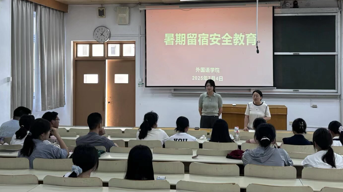 2025年7月4日下午,外国语学院暑期留校安全教育暨考研推进会,在三阶梯教室有序开展。外国语学院党委副书记王倩、辅导员吴耀、潘玥与全体暑期留校学生齐聚一堂,共话安全保障与考研征程。