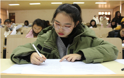 各位团小组成员准时入场,按照事先排好的位置分班级就坐,接着便是由外国语学院团总支的干事分发试卷。试卷共有三页,题型为单选题和多选题。同学们在考试之前就已熟记《团干部应知应会200题》,所以题目做的十分顺利。竞赛结束后,由外国语学院团总支的干事留下来批改试卷,做最后的收尾工作。