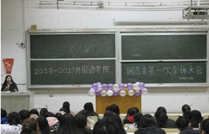 2018年11月9日下午5:30外国语学院团总支于一阶召开第一次全体大会。此次大会的主题是“团结合作共成长,同筑美好大家庭”。大会由张雨嫣主持,参与人员包括外国语学院团总支书记王姗老师、副书记张雨欣、董佳琦、王超,各部长及各部门干事。