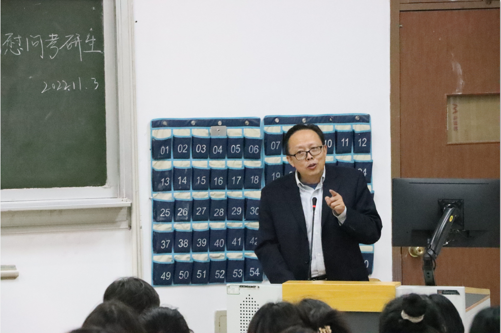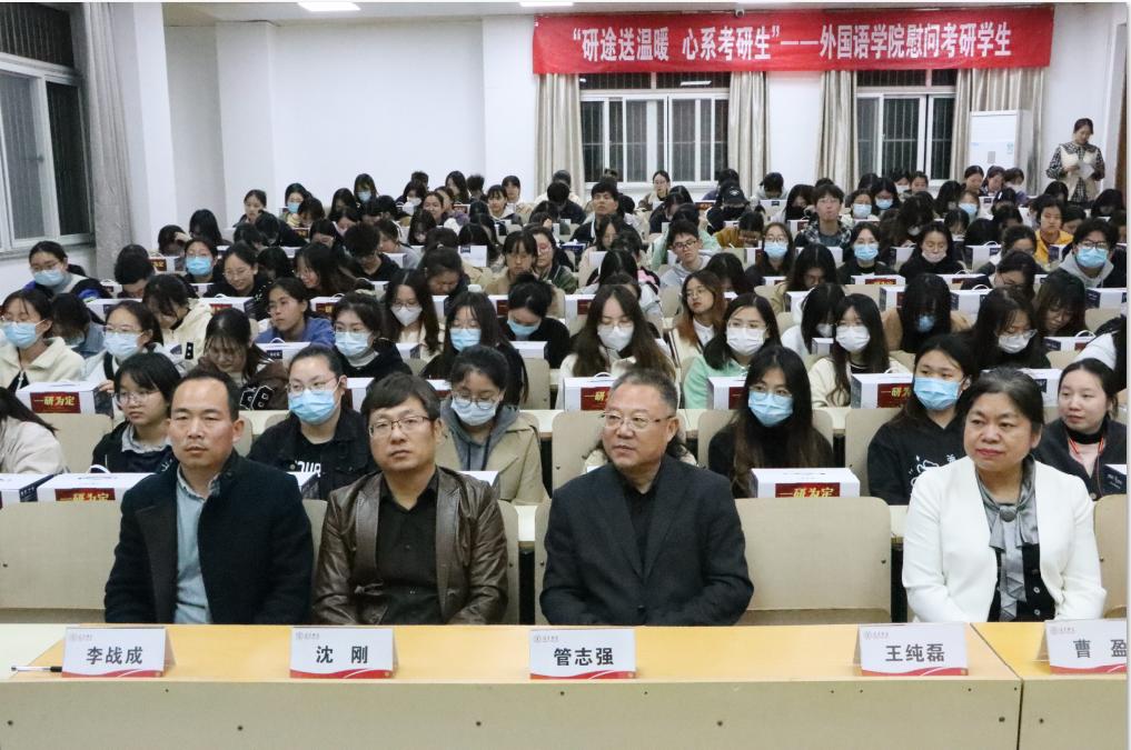 考研倒计时50天,为帮助考研学子坚定目标,调整心态,外国语学院于11月3日在一号楼三阶教室开展了“研途送温暖,心系考研生”助力考研活动。学院领导班子、毕业班辅导员及全体2023届考研学生参加本次活动。