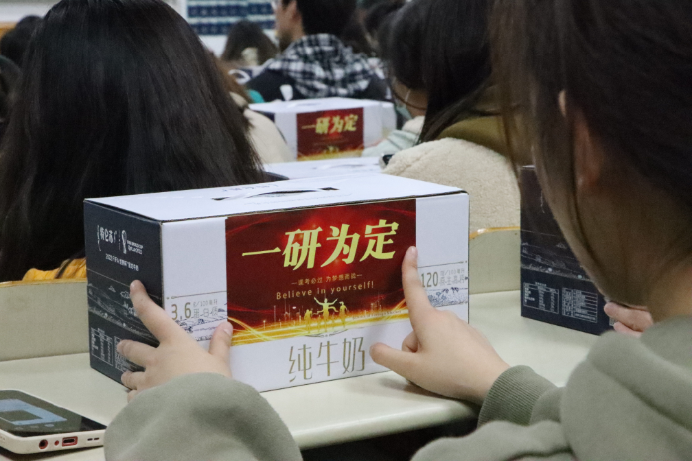 学院为考研学子们准备了牛奶,箱体上贴上了“一研为定”的美好祝愿,让同学们在奋斗的征程中充满力量。外国语学院副院长(主持行政工作)王纯磊代表院领导肯定了同学们求学奋进的努力。他说,学院永远是大家实现梦想道路上坚强后盾,希望同学们在最后冲刺阶段稳定心态、努力拼搏、坚持到底,并预祝他们能够实现梦想,一战成硕。学院的鼓励与学弟学妹们祝福的视频,激发了考研同学们的斗志,坚定了他们上岸的信念。(撰稿人:李战成)