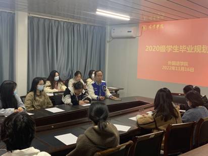 2022年11月16日,邀请大四辅导员李战成老师对2020级学生中准备直接公司就业的同学做毕业规划指导及就业前景分析。学生先简单列出自己的毕业规划及目前准备情况,并现场谈了自己的就业想法;李老师建议学生就业三步走,第一步,通过生涯人物访谈或互联网了解目标职业要求;第二步,对照目标职业要求审视自己,找出自己的优势和需要改进的地方;第三步,在接下来的大学时光中对照目标要求,查漏补缺;接着,李老师又根据各位同学的计划做出具体分析和指导。通过交谈,同学们更加清晰地认识到接下来的大学学习重点和准备方向。