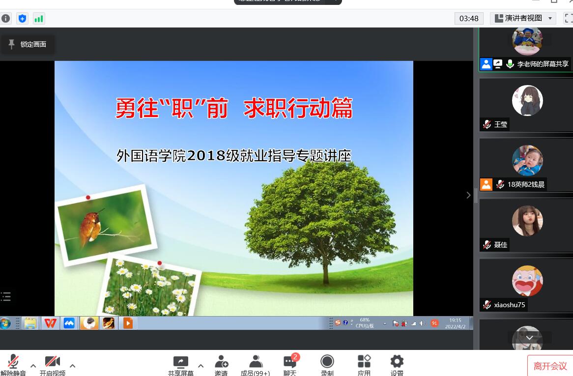 4月2日晚,外国语学院开展2018级毕业生就业指导线上专题讲座。毕业班辅导员李战成老师主讲,2018级全体毕业班同学参加。