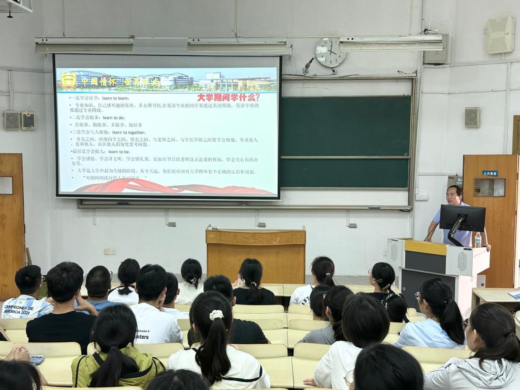 为全面贯彻落实立德树人根本任务,深入推进学校“锦囊工程”,引导2023 级新生树立生涯规划意识,激发学习原动力,外国语学院于9月 10日下午在4212教室开展了2023级新生职业生涯规划教育专题讲座。讲座由国家二级职业指导师、2023级新生辅导员李战成老师主讲,188名 2023级新生参加讲座。
