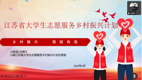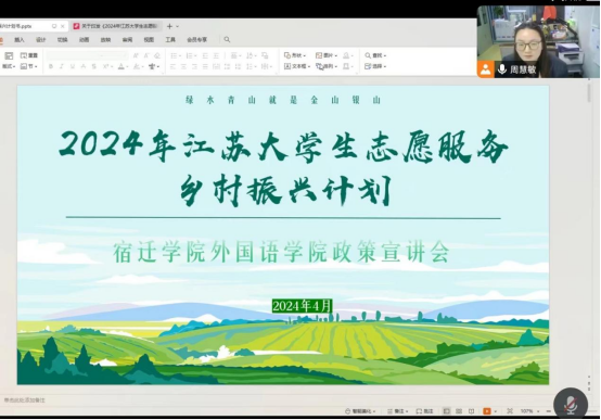 为贯彻党的二十大精神,推进“江苏大学生志愿服务乡村振兴计划”的宣传招募工作,外国语学院于2024年4月23日在线上召开了江苏大学生志愿服务乡村振兴计划宣讲会。本次宣讲会由2024届毕业生辅导员周慧敏老师主持,2023届毕业生马博文同学和部分2020级、2021级同学参会。