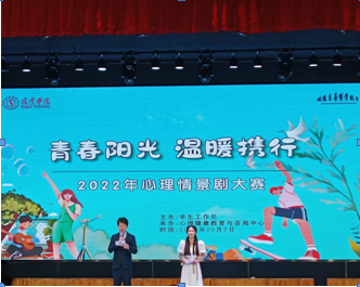 为传播心理健康理念,共同构建活力、温暖、向上的校园氛围,2022年10月7日晚,我校在大学生活动中心一楼多功能厅举行“青春阳光,温暖携行”心理情景剧大赛。