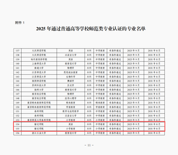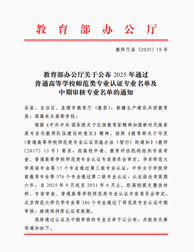 近日,教育部办公厅公布了2025年通过普通高等学校师范类专业认证及中期审核的专业名单,我校英语专业成功通过师范类专业第二级认证。